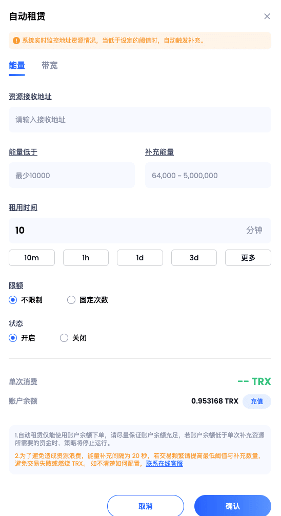 你可以提前设置资源阈值、租赁数量与时长,一旦地址资源不足,系统会自动为你触发租赁,无需代码操作和人工干预。