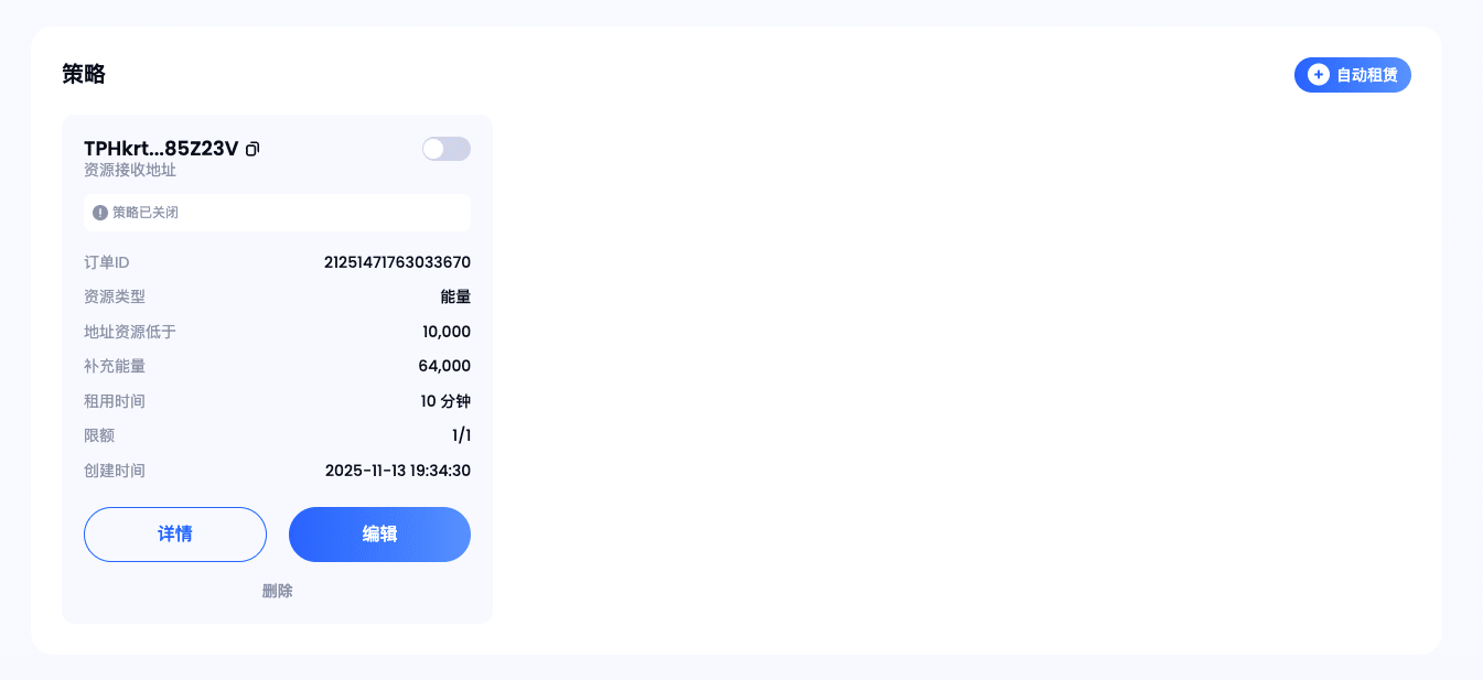 自动租赁是一种为 TRON 地址持续补充能量/带宽的方式。